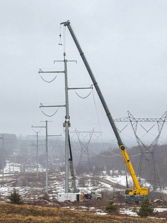 Cranes, pictured at right, lifted and installed the last of the project’s 644 poles in Remsen, rebuilding a 55-mile corridor to strengthen the state’s energy grid and strengthen it against storms. The poles will carry a 345 kV transmission line from Croghan to Marcy.